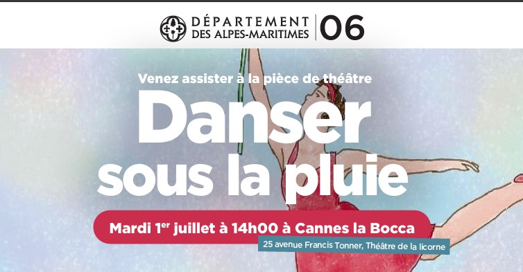 Avec l’ouverture de la Maison de l’Autonomie de Cannes et dans le cadre du Plan Départemental d’Aide aux Aidants Seniors & Handicap, le Département et le Centre Communal d’Action Sociale de Cannes (CCAS) proposent, en partenariat avec Cannes Seniors Le Club et la Ville de Cannes, une pièce de théâtre « Danser sous la pluie » à destination des aidants de personnes âgées et de personnes en situation de handicap.